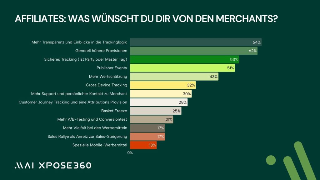 Genau diese Transparenz ist jedoch ein Kernanliegen der Affiliates. 64 Prozent wünschen sich mehr Einblick in Tracking-Logiken, 53 Prozent fordern sicheres Tracking und 32 Prozent wünschen sich mehr Cross Device Unterstützung. Die Forderung nach Customer-Journey Tracking und Attributionsprovisionen zeigt zudem, wie stark Affiliates in Zukunft in datenbasierte Modelle eingebunden werden wollen.