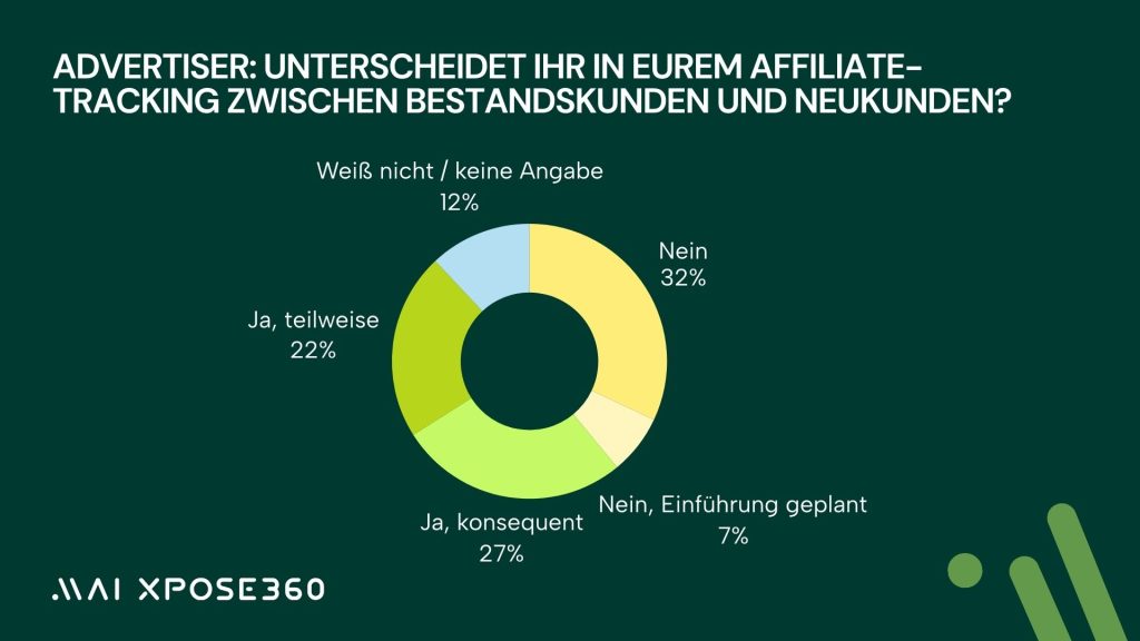 Interessant ist auch die Frage der Neukunden und Bestandskunden Differenzierung. 27 Prozent der Advertiser trennen 2026 konsequent zwischen Neukunden und Bestandskunden in ihren Affiliate-Kampagnen, 22 Prozent tun dies zumindest teilweise. 32 Prozent unterscheiden nicht, und 7 Prozent planen die Einführung für das kommende Jahr.