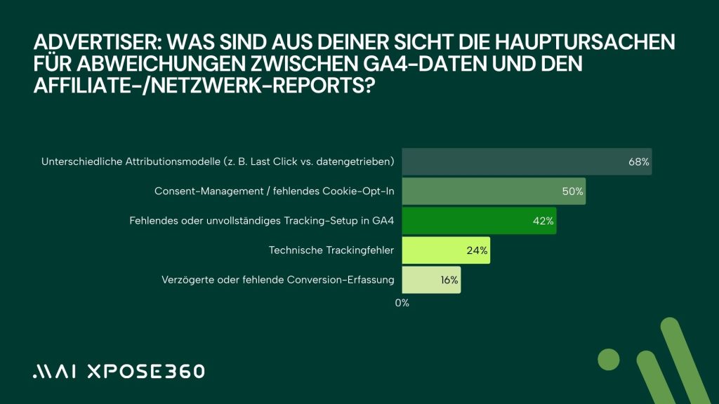 Gleichzeitig wird sichtbar, dass viele der früheren Tracking-Probleme nicht technischer, sondern methodischer Natur waren. Die größte Ursache für Abweichungen zwischen GA4 und Affiliate-Reports liegt 2026 laut Advertisern mit 68 Prozent in unterschiedlichen Attributionsmodellen. Während GA4 zunehmend datengetrieben oder Multi-Touch arbeitet, basieren Affiliate-Systeme häufig auf Last-Click Modellen. 50 Prozent nennen Consent-Probleme als zentrale Ursache für Messdifferenzen, 42 Prozent diagnostizieren ein unvollständiges oder fehlerhaftes GA4 Setup. Studien wie die von Analytics Mania oder Search Engine Journal belegen seit Monaten, dass Unternehmen große Schwierigkeiten damit haben, GA4 korrekt zu konfigurieren und Attributionsschwankungen richtig einzuordnen. Die Trend-Umfrage zeigt damit sehr deutlich: das Tracking- Problem der Branche ist weniger das Netzwerk-Tracking – es ist die Fehlinterpretation der Daten auf Advertiserseite.