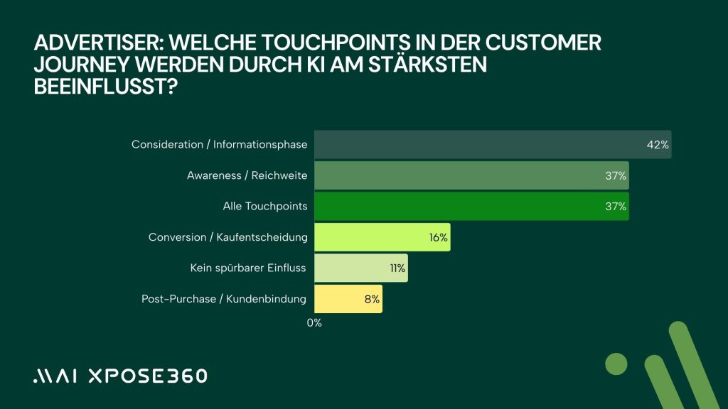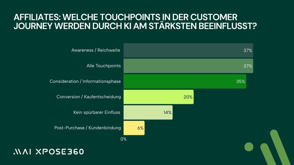 Die Auswirkung wird noch deutlicher bei der Betrachtung der Touchpoints, die durch KI am stärksten beeinflusst werden. 42 Prozent der Advertiser und 35 Prozent der Affiliates sehen die stärkste Veränderung in der Consideration Phase, also der Informations- und Bewertungsphase. Genau hier waren früher Content- und SEO-Publisher dominant. 37 Prozent beider Gruppen sehen zudem starke Auswirkungen auf Awareness, was Social-Media Publisher, Influencer und videoorientierte Formate stärkt. Für Conversion-Effekte sehen 16 Prozent der Advertiser und 20 Prozent der Affiliates klare Veränderungen. Post Purchase Effekte werden dagegen nur von 8 Prozent der Advertiser und 6 Prozent der Affiliates als relevant betrachtet. Dass jeweils 37 Prozent von einer Veränderung aller Touchpoints ausgehen, zeigt, wie umfassend KI die Rolle der Publisher und deren Platz in der Journey verschiebt.