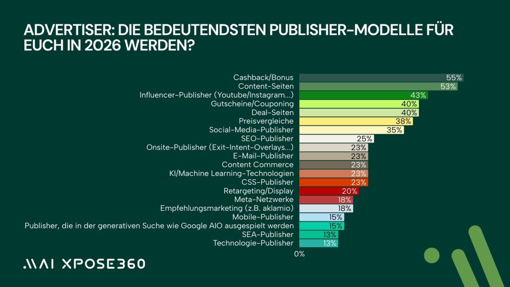 Besonders sichtbar wird dieser Wandel beim Blick auf die wichtigsten Publisher-Modelle der Advertiser im Zeitraum 2024 bis 2026. Cashback bleibt mit 55 Prozent ein relevanter Hebel, auch wenn der Wert leicht unter dem Niveau von 2025 liegt. Content-Seiten erleben nach Jahren des Rückgangs eine Renaissance und steigen von 41 Prozent auf 53 Prozent. Gleichzeitig bleibt Couponing stabil bei 40 Prozent, nachdem der Bereich 2025 spürbar schwächer war. Deal-Seiten liegen stabil bei 40 Prozent und Preisvergleiche erreichen mit 38 Prozent wieder ein höheres Niveau als im Vorjahr. Social-Media Publisher, die 2025 nur 21 Prozent erreichten, springen 2026 auf 35 Prozent. Ähnliches gilt für Influencer-Publisher, die sich von 28 Prozent auf 43 Prozent steigern und damit erstmals zu den stärksten Modellen gehören. Deutlich wird jedoch auch, dass SEO-Publisher trotz eines leichten Anstiegs auf 25 Prozent weiterhin unter Druck stehen. Dieser Auftrieb reicht nicht aus, um den Verlust organischer Reichweite auszugleichen. Aufgrund der generativen Suche verschiebt sich die Sichtbarkeit vieler klassischer Content- und SEO-Modelle zunehmend in Richtung AI-Overviews und conversationaler Interfaces. Dass erstmals 15 Prozent der Advertiser Publisher-Modelle relevant finden, die in generativen Suchmaschinen wie Google AI-Overviews ausgespielt werden, bestätigt diese Entwicklung.