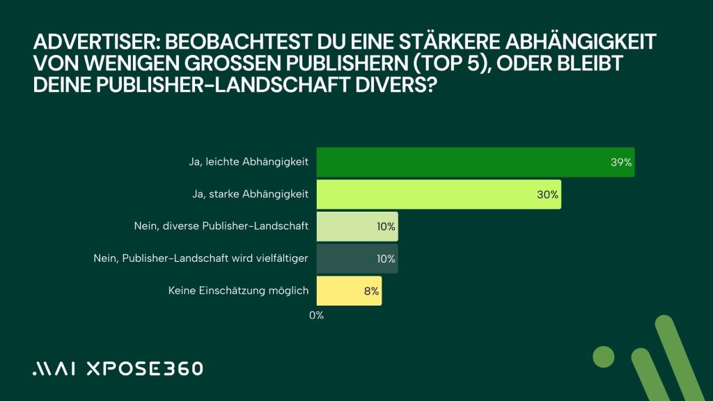 Parallel dazu beobachten viele Advertiser eine zunehmende Abhängigkeit von wenigen großen Playern. 33 Prozent berichten von einer stark steigenden Konzentration auf die Top 5-Publisher und 39 Prozent von einer leichten Zunahme. Nur 10 Prozent sehen weiterhin eine stabile Diversität im Publisher Mix und weitere 10 Prozent sogar eine wachsende Vielfalt. Diese Polarisierung zeigt sich insbesondere in Märkten, in denen Cashback, Influencer, Social-Commerce Player und große Technologie Anbieter wie Onsite-Tools oder Recommendation-Engines einen immer größeren Anteil des Umsatzes auf sich vereinen. Kleinere Publisher und klassische Content-Modelle verlieren dagegen erheblich an Sichtbarkeit.