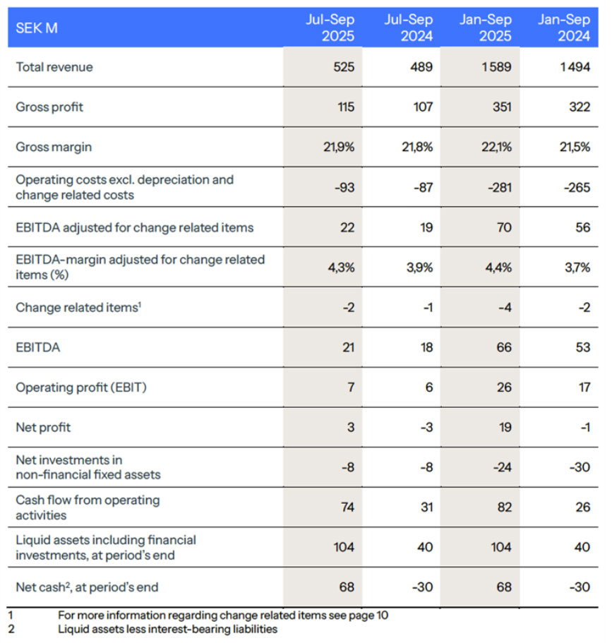 Das operative Ergebnis vor Abschreibungen (EBITDA), bereinigt um Sondereffekte, belief sich auf 70 Millionen SEK, ein Anstieg gegenüber 56 Millionen SEK im Vorjahr. Die EBITDA-Marge gemessen am Bruttogewinn lag bei 18,8 Prozent (Vorjahr: 16,5 Prozent).